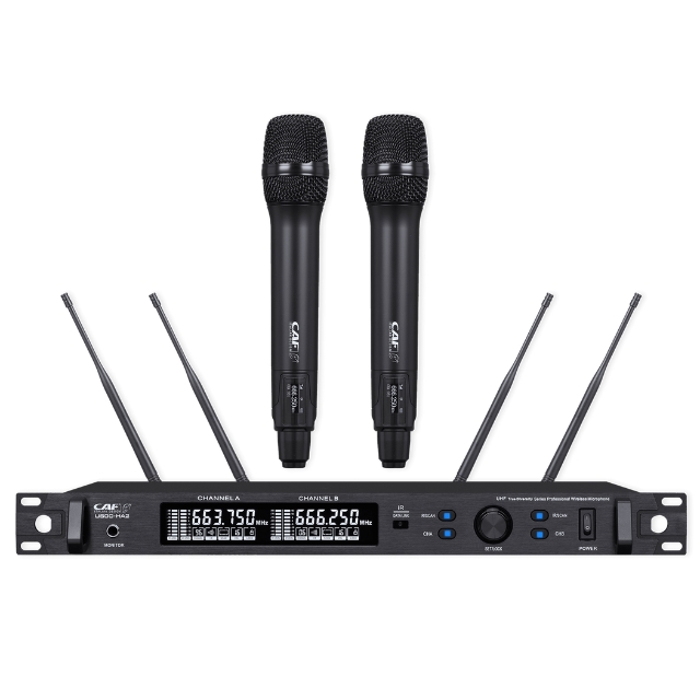 - Hệ thống không dây UHF 2 kênh, 100 tần số cho mỗi kênh là tùy chọn.